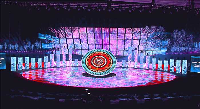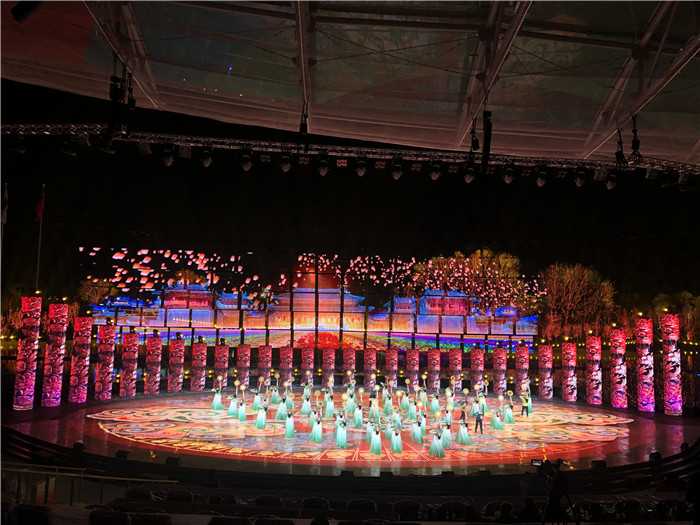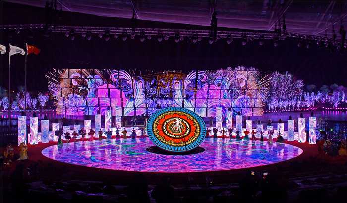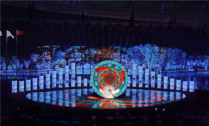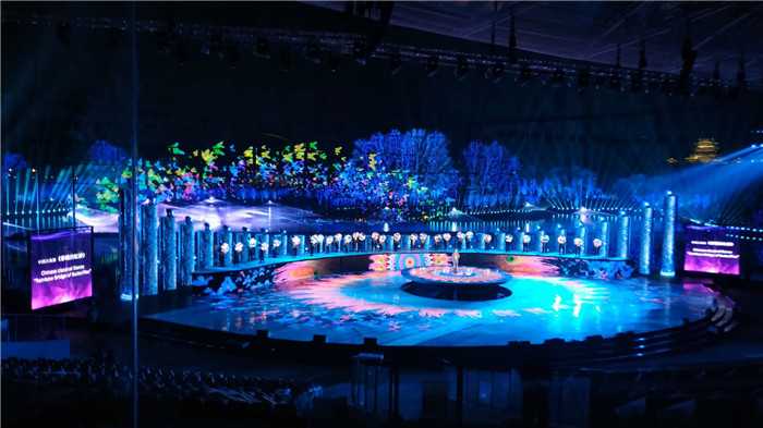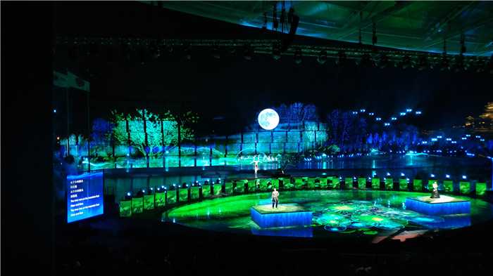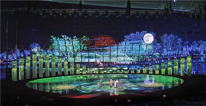 北京嘉明偉視國際會展有限公司承擔(dān)了此次2019年北京世界圓藝博覽會開幕式主舞臺和備用場地的所有LED的制作、施工、調(diào)試和播控工作。而本次文藝演出的所有顯示屏都來自于深圳市光祥科技股份有限公司,覆蓋了多樣化的舞臺異形屏,曲面屏,透明屏等定制顯示屏。其中1900平方米的網(wǎng)幕屏在舞臺南側(cè)的湖面上空,其擁有高亮防水,結(jié)構(gòu)靈活,抗風(fēng)等級高,再依托于威亞吊裝系統(tǒng),結(jié)合編程組合、穿插調(diào)度,將畫面和湖面的倒影呈現(xiàn)出別樣的生動。尤其是特制的直徑8米圓形網(wǎng)幕屏能上下左右移動,湖水當(dāng)空,和潤圓月,美輪美奐。