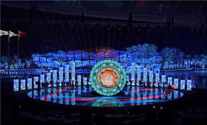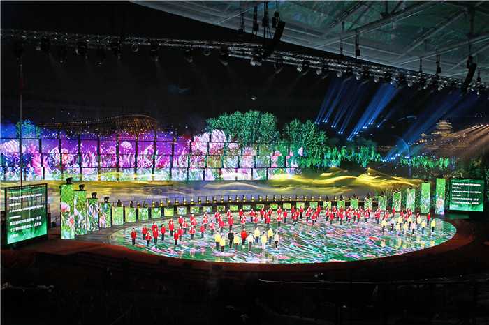 整場演出都圍繞“綠色生活、美麗家園”的辦會主題,以“人與自然的關(guān)系”為主線,主舞臺的雙月牙地屏、29個圓柱屏、升降臺屏等超過600平米多樣化的異形顯示屏,不斷描繪出多彩絢麗的美景,遠(yuǎn)迎星辰大海,近歸山水田林。主舞臺上29根圓柱屏配合機械升降宛如一個個舞者精靈,伴隨旋律演繹著更多的律動之美。
