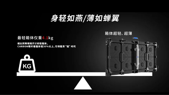 Carbon系列外觀精簡,將輕薄進行到底。主材采用新興輕量化碳纖維材質,最輕重量僅4.1KG。相比同等規格尺寸的鋁箱體,Carbon碳纖維箱體輕30%以上,引領租賃“輕”時代。Carbon系列身輕如燕、薄如蟬翼的特質,在LED顯示屏實際搭建過程中,大幅節省人力時間成本。