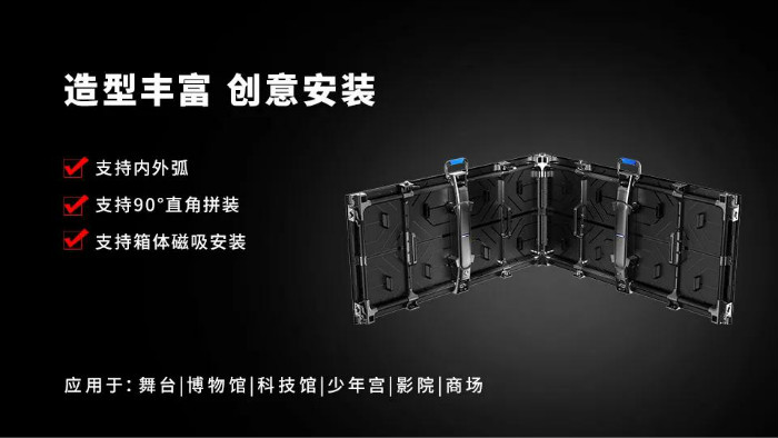 租賃屏的魅力在于所呈現的創意style。Carbon系列能實現諸多舞美造型,支持內外弧、90°拼裝,且又新增快捷磁吸安裝,提升人工作業效率。產品有著廣泛運用前景,搭配專業技術方案,能千變萬化于舞臺、博物館、科技館、少年宮、影院、商場等不同空間領域。