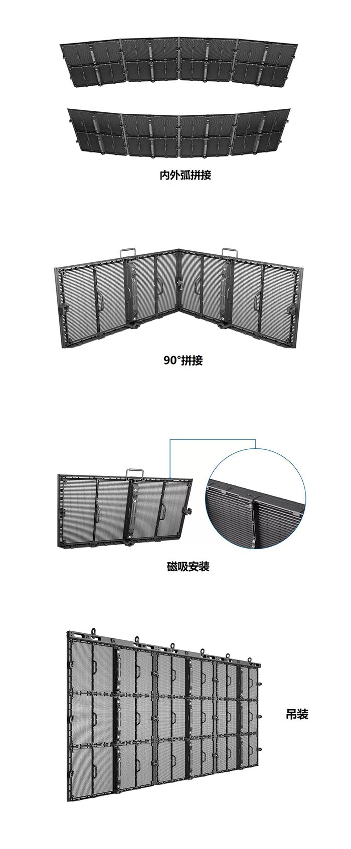 相比普通透明屏,Vanish在安裝方面占據明顯優勢。超大弧形拼接,弧形鎖可調節范圍-15°~15°?;⌒捂i能直接更換為直角鎖,實現快捷90°拼接。除常規座裝、吊裝,Vanish可選磁吸箱體,上下拼接一步到位。