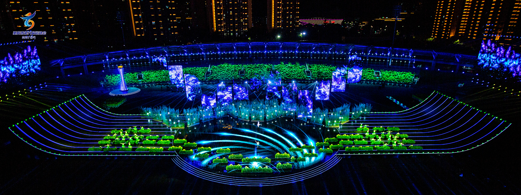 位于舞臺后方的1100平方米LED透明顯示屏(LC系列)也是這次開幕式的亮點,屏幕銳利通透,顏色均勻,可視角度大,防水性能出色,透過高清畫面,后方燈火輝煌的城市夜景一覽無余,圍繞“山水之城·美麗之地”等主題內容,將科技元素與體育精神相融合進行立體展現,彰顯新時代城市精神。唯美的視覺體驗、炫酷的科技元素,開啟了一場十分震撼的視聽體驗。