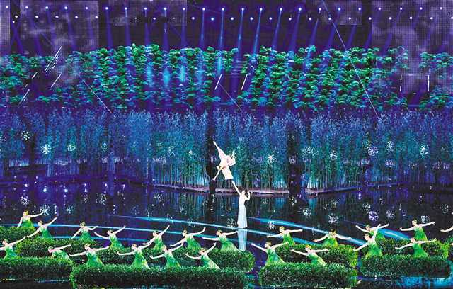 在率先上演的群舞《茶竹飄香》中,伴隨著優美旋律,演員們在“竹海”中翩翩起舞,舞臺上方的650平方米網幕顯示出一幅月照竹林的美麗畫面。唯美的畫面、優美的音樂、搭配上演員們曼妙的舞姿,讓現場觀眾如癡如醉,現場氛圍被推向了高潮。