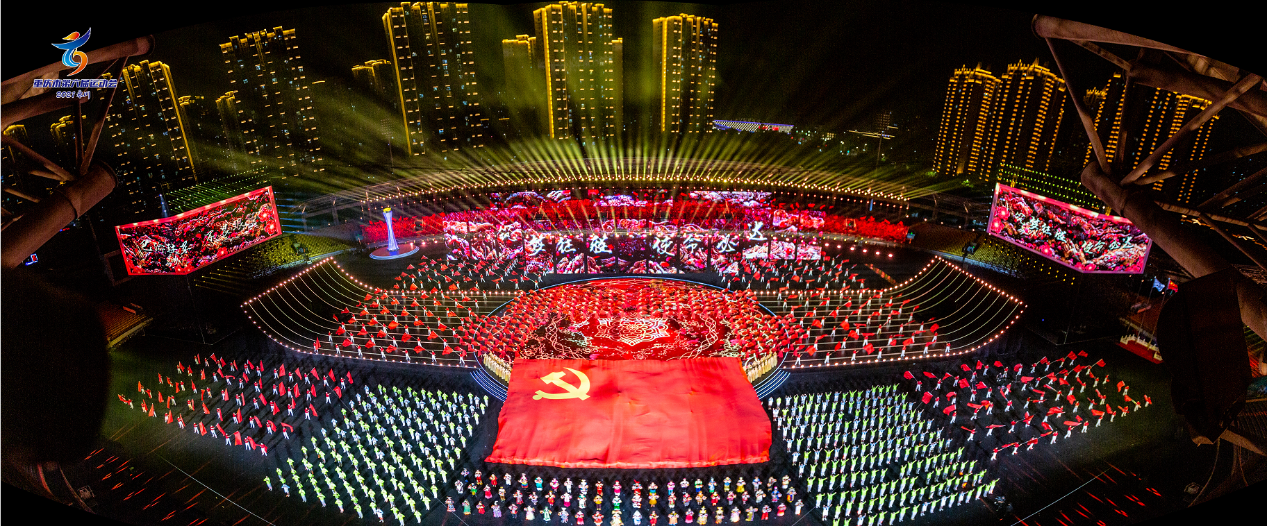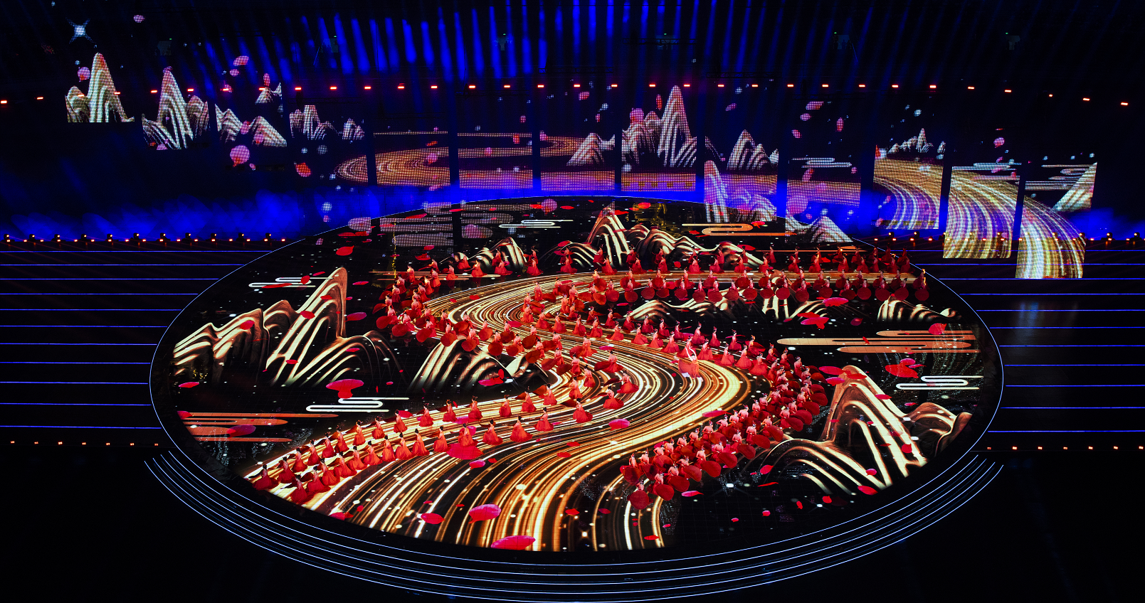 舞臺中央特制的直徑45米圓形地磚屏,全程大放異彩。1632平方米地屏畫面伴隨著節目的變化,時而是明月高山,寧靜高遠;時而變成紅色經典,慷慨激揚。地屏、透明屏、空中網幕交相輝映,結合聲、光、電、數字影像等高科技元素,增強文體展演的科技感,并通過在現場使用VR虛擬現實、全息投影等技術,讓觀眾仿佛身臨其境,在驚嘆LED魅力的同時對六運會的精彩紛呈充滿期待。