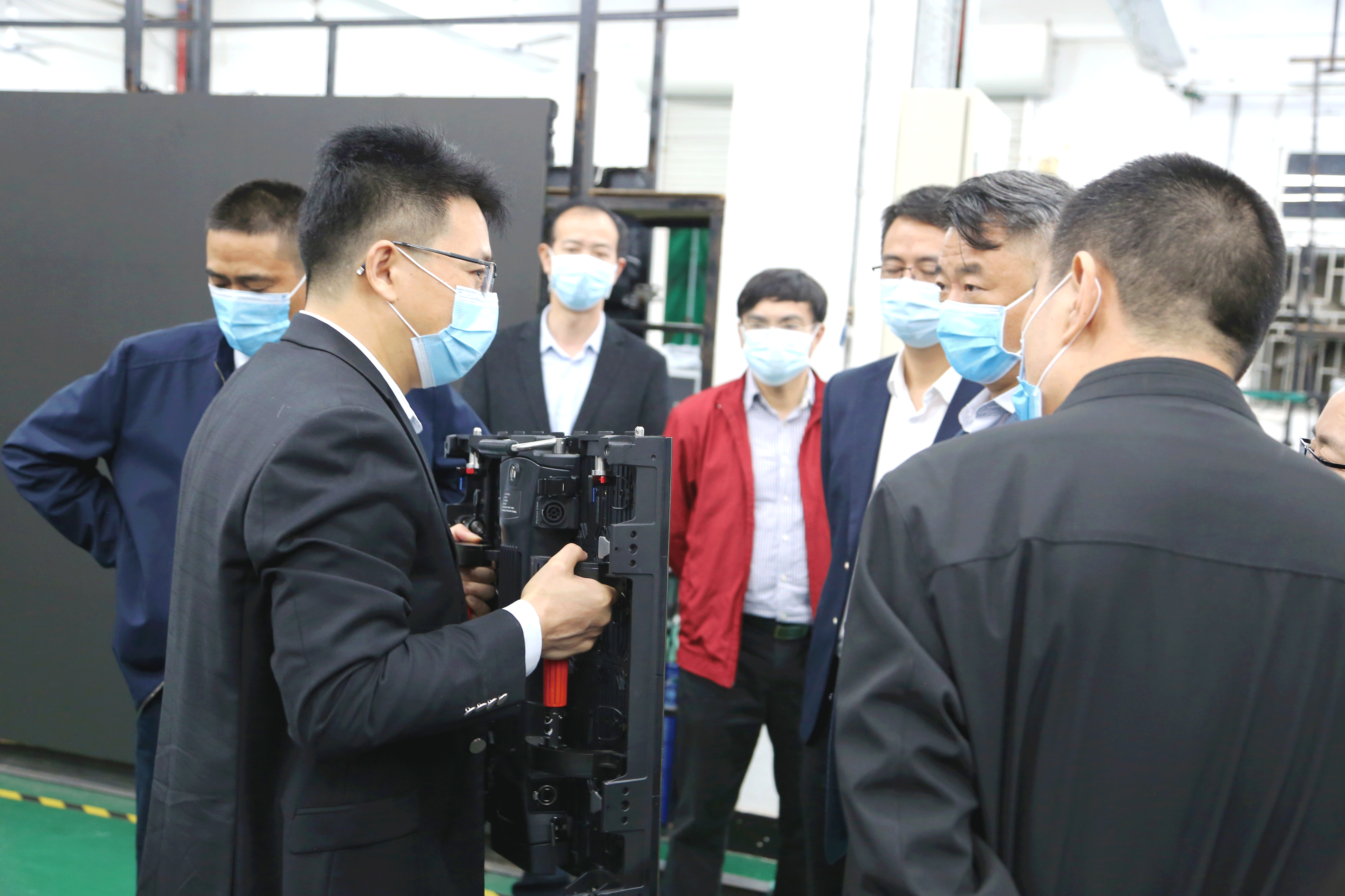 在生廠車間,為龍崗區領導展示了室內外高清LED顯示屏、異形屏、固裝顯示屏、透明屏等一系列光祥研發創新成果,并講解每款LED顯示屏不同的性能與應用。