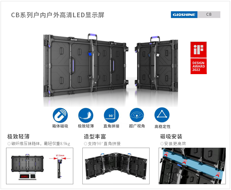 光祥CB系列戶內(nèi)戶外高清LED顯示屏采用碳纖維壓鑄箱體,戶內(nèi)屏最大厚度僅67.5mm,1000mm*500mm箱體小于等于8.9kg,500mm*500mm僅5.5kg;戶外屏最大厚度僅69.5mm,1000mm*500mm箱體不超過(guò)9.1kg,同面積箱體重量創(chuàng)行業(yè)戶內(nèi)外移動(dòng)租賃屏新低。