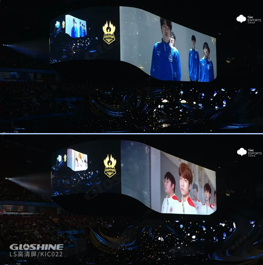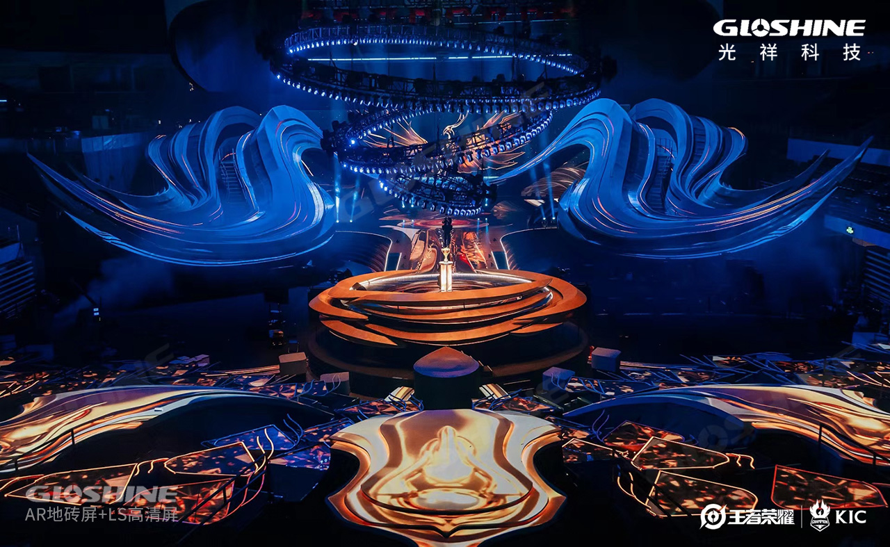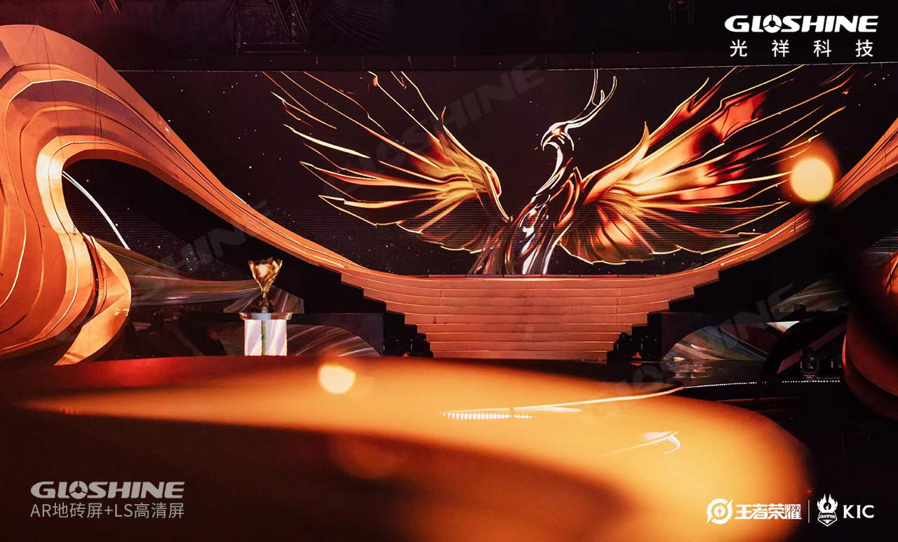 昨晚的春繭體育館異常火熱,世界最優秀的兩大王者戰隊及粉絲們熱情似火,點燃全場。主舞臺如展翅翱翔的鳳凰,焰火四射,時而又冷艷、蓄勢待發。這是光祥AR系列地磚屏帶來的視覺體驗,炫麗奪目。