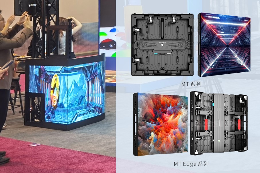 前臺側邊是MT及MT Edge打造的小型裸眼3D小展臺,小巧精致。新一代的MT 和MT Edge 系列屏幕超薄箱體,支持標準展架、無底座落地安裝等,箱體內部走線簡潔美觀,造型百變。MT Edge單箱體最大弧度±80°,五個箱體可拼圓柱,最小直徑僅0.8米,造型豐富,靈活多變,是展覽、會議常用屏幕。