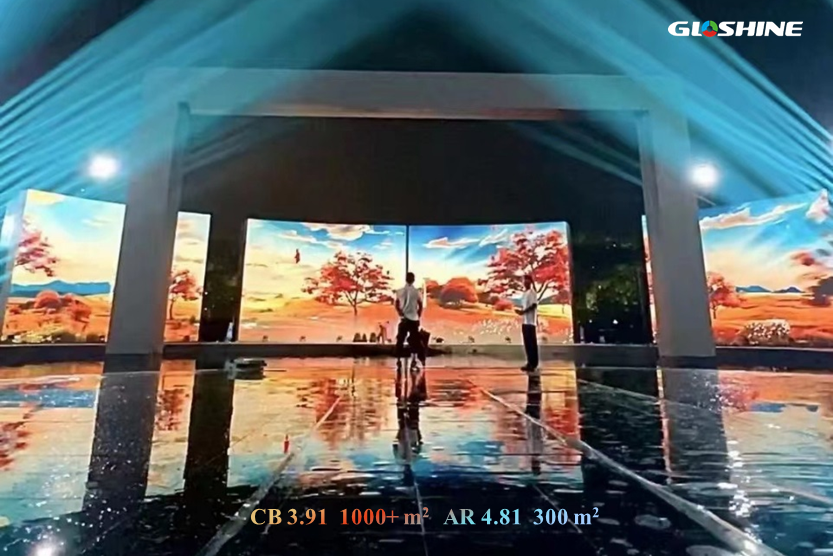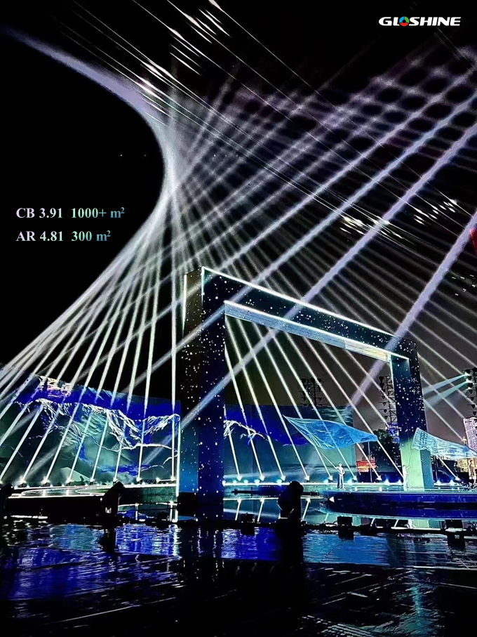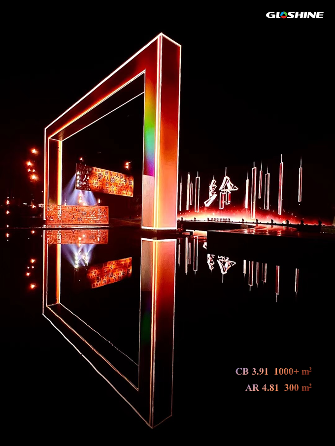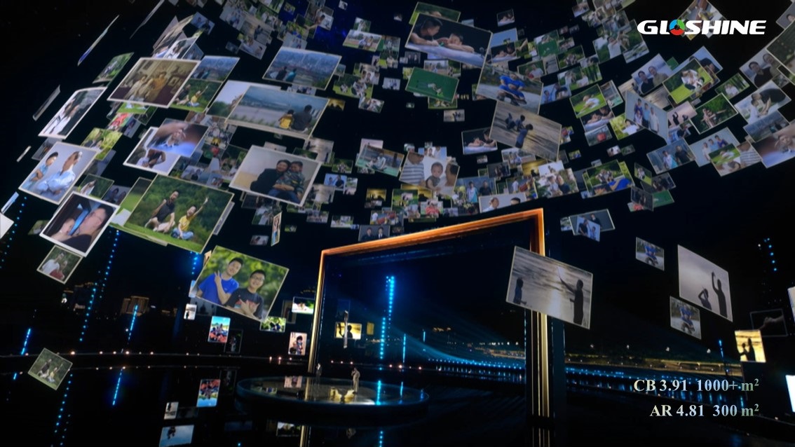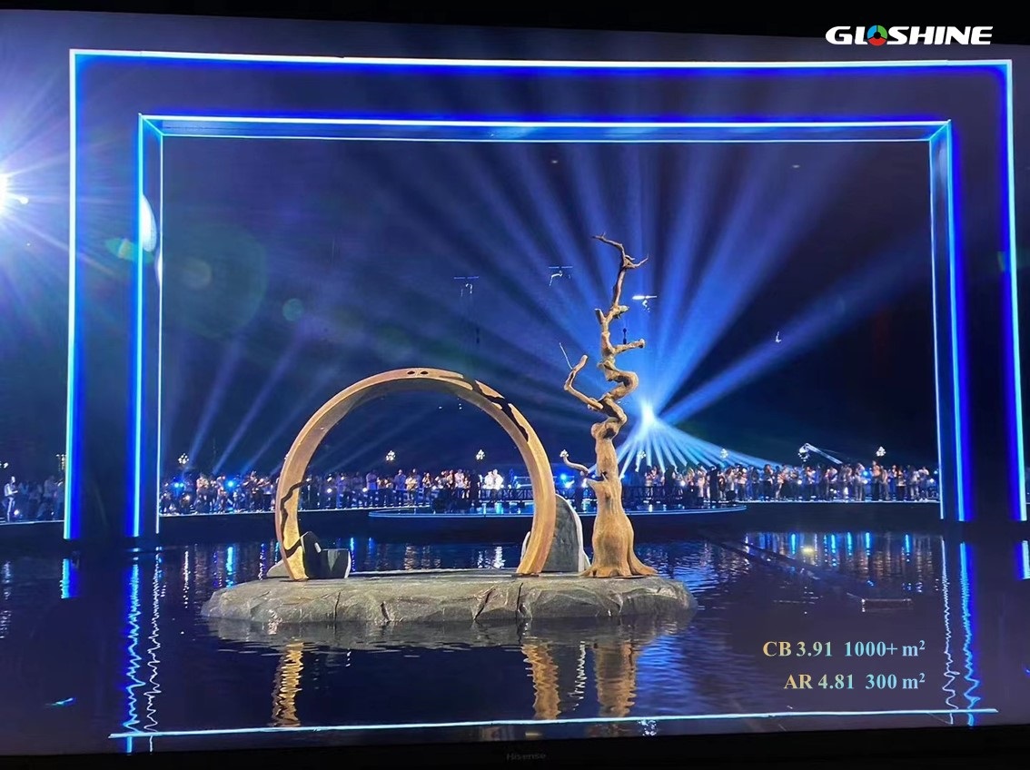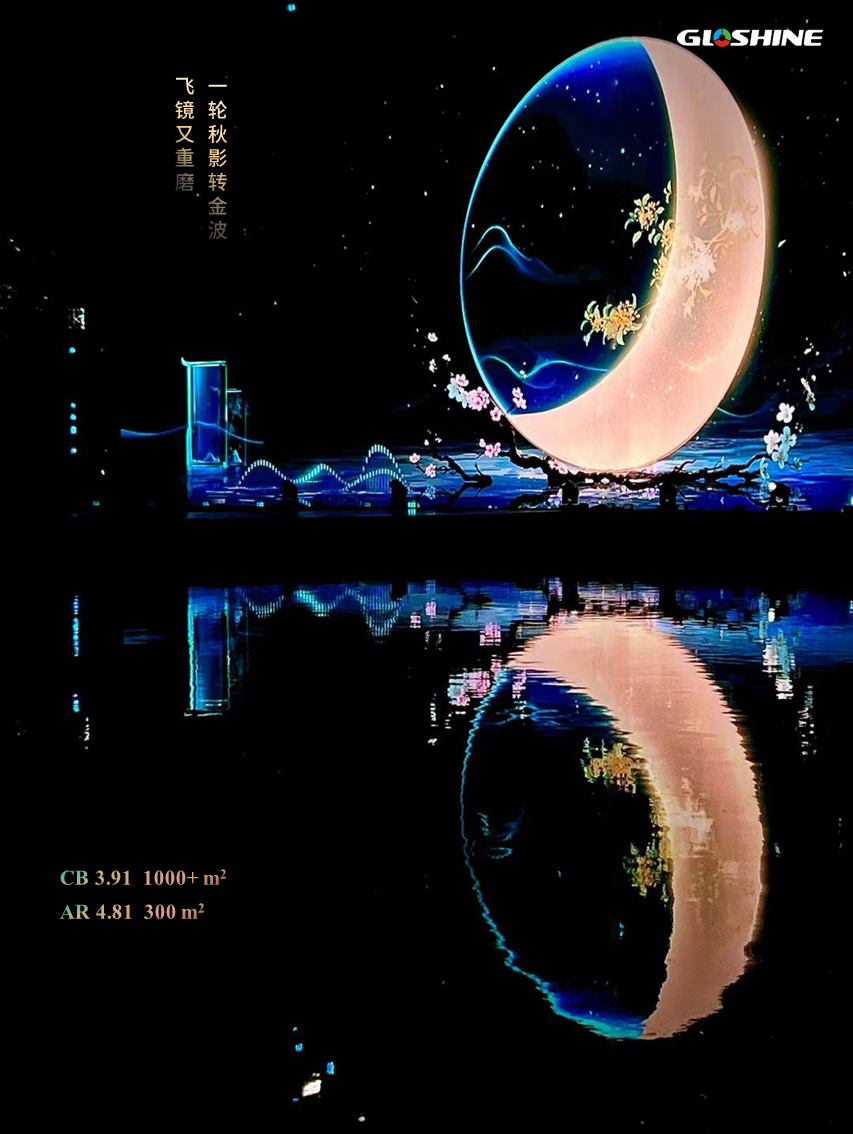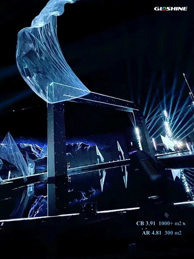 可移動的背景大屏也是由CB碳纖維屏塑造,均為大弧造型,環繞于湖畔,開合自如。時而亭臺水榭、江山風景,時而熒熒星空、鄉村城市,與“鏡框”相輝映,唯美浪漫。