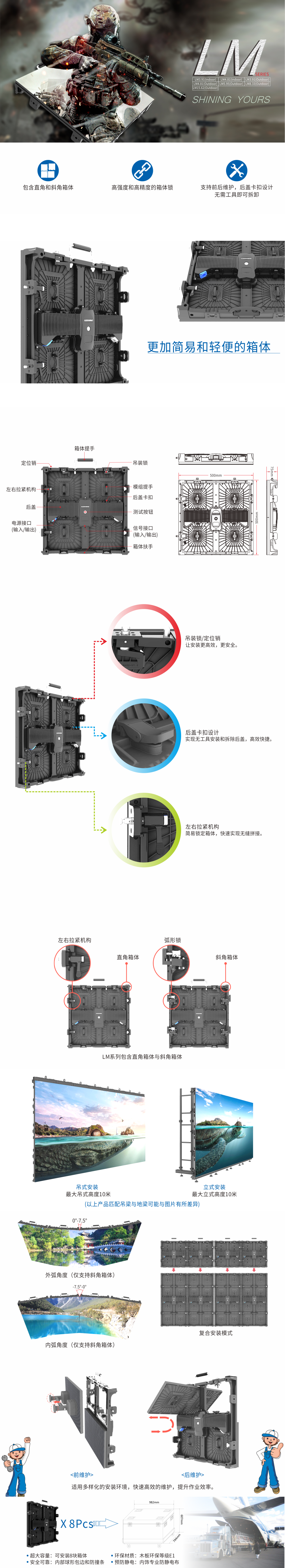 LM系列,區(qū)別于LS系的大塊頭,也同樣擁有豐富的內(nèi)涵與美感;箱體采用全黑電泳工藝,美觀大方,富有質(zhì)感;箱體涵蓋直角與斜角,可實(shí)現(xiàn)多種內(nèi)外弧的拼接;箱體連接件采用高強(qiáng)度金屬材質(zhì),精度高,堅(jiān)固耐用;模組支持前后維護(hù);電源后蓋搭扣鎖設(shè)計(jì),拆卸無(wú)需工具,維護(hù)更便捷。
