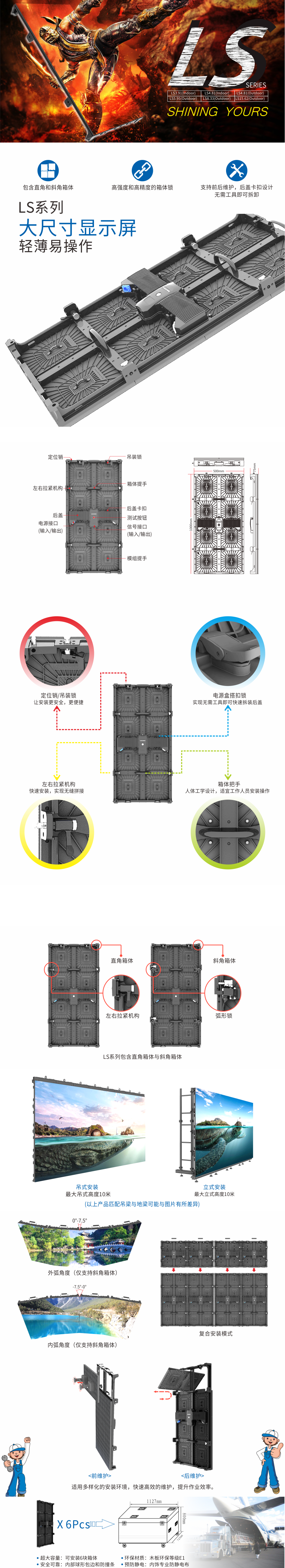 LS系列,突破了LED顯示屏箱體工業設計的束縛,開創了后來者追逐的“經典”;500mm*1000mm箱體采用全黑電泳工藝,安裝快捷,效率倍增;箱體涵蓋直角與斜角,可實現多種內外弧的拼接;箱體連接件采用高強度金屬材質,精度高,堅固耐用;模組支持前后維護;電源后蓋搭扣鎖設計,拆卸無需工具,維護更便捷。