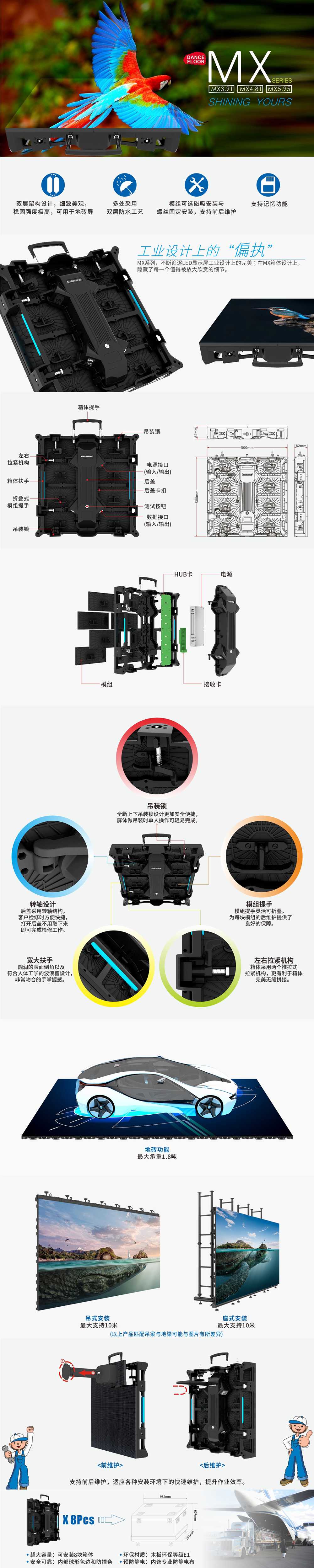 產品概述:最新版緊湊型箱體;真正實現快速安裝,前維護;戶內戶外通用租賃LED顯示屏,5000:1高對比度,戶外5000nits;超級牢固可做地板可載汽車;創新的吊裝鎖,一個人即可完成操作;電源后蓋維修方便。