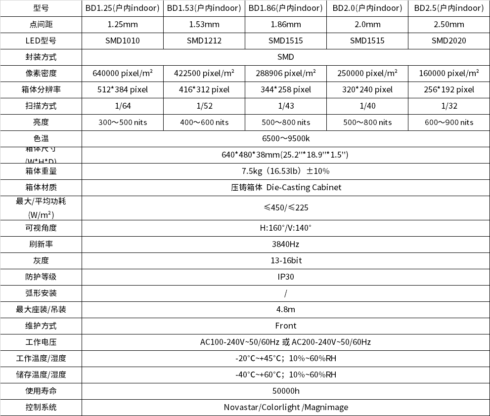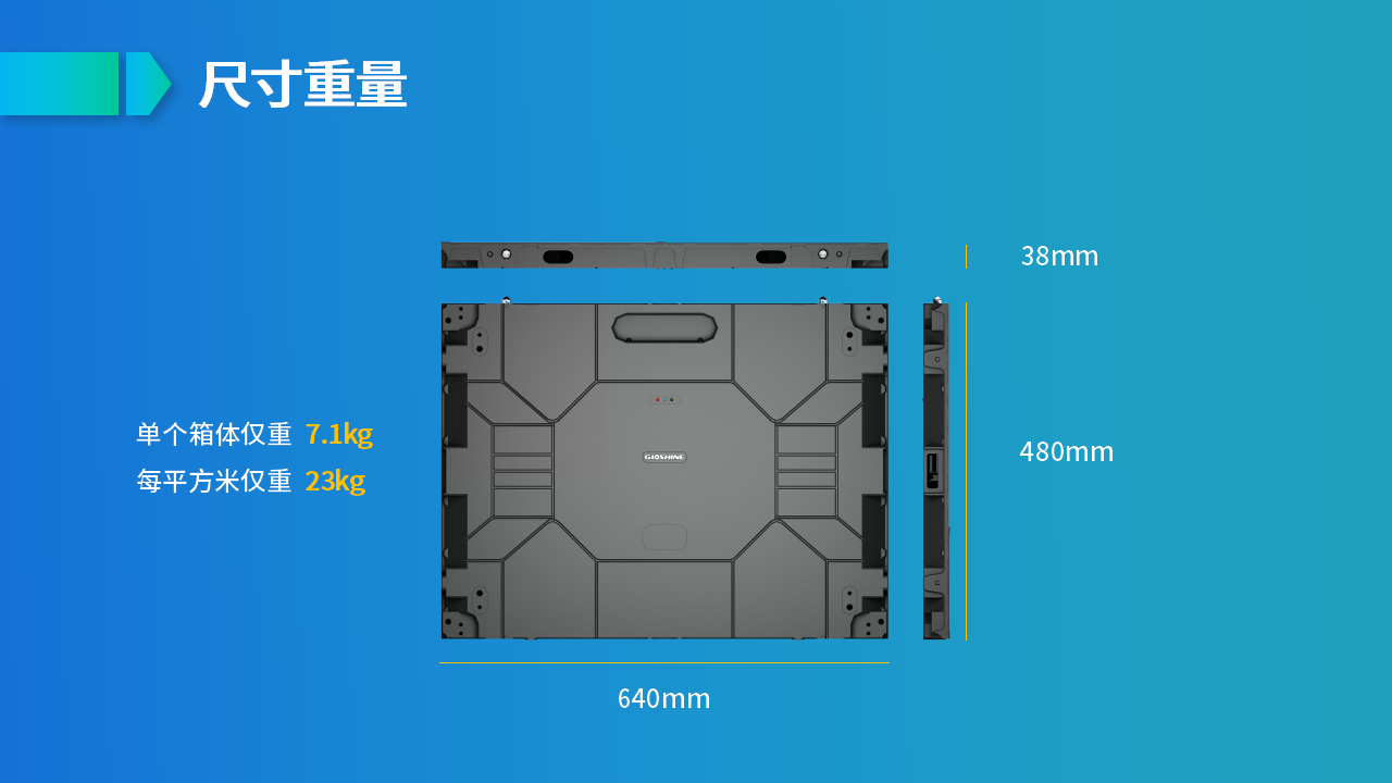 BD系列,一體化工業設計,四合一燈珠,卓越的顯示效果,毫發畢現;無外部線材,產品外觀簡約干凈;簡潔結構設計,高性價比;極致輕薄,僅重7.1kg;防磕碰設計,更好的保護燈珠,為運輸安裝保駕護航。